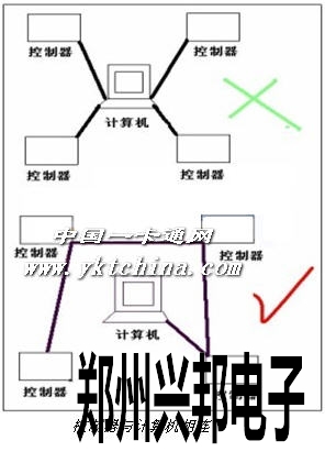 控制器通訊線(包括485/422、232和韋根等通訊線)必須采用國際通用的8芯屏蔽雙絞線,這樣可有效防止和屏蔽干擾。線徑大于0.3mm總線長度不超過1200建議在1000米以內,如果更長請選用其它專用485/232轉換器或者加中繼器,并選用更粗的通訊電纜??刂破鱃ND 485- 485+分別對應連接485轉換器GND TD(A) TD(B),通訊線路采用串聯掛接式連接,請勿采用星型連接或者局部星型連接(如圖)。