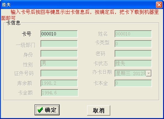 補卡操作的第一步:將丟失的卡進行掛式,在軟件卡管理——卡掛失,輸入要掛失的卡號,然后按回車鍵,出現(xiàn)卡的基本信息后,點擊確定鍵(如圖一)