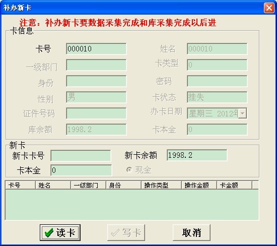 第三步:將一張未發(fā)行過的卡放到讀卡器上,在軟件卡管理——補辦新卡,在出現(xiàn)的界面中輸入要補辦的卡的卡號,然后按回車鍵, 在出現(xiàn)丟失卡的卡信息后,點擊讀卡,寫卡,這張新卡就將原來的卡補辦了!(如圖二)