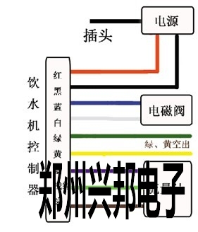 紅線----->12V電源正極,黑線----->12V電源負(fù)極,藍線----->電磁閥一端,白線----->電磁閥另一端,綠線、黃線空出,紫線----->流量計負(fù)極,淺綠線----->流量計信號線,棕線----->流量計正極。