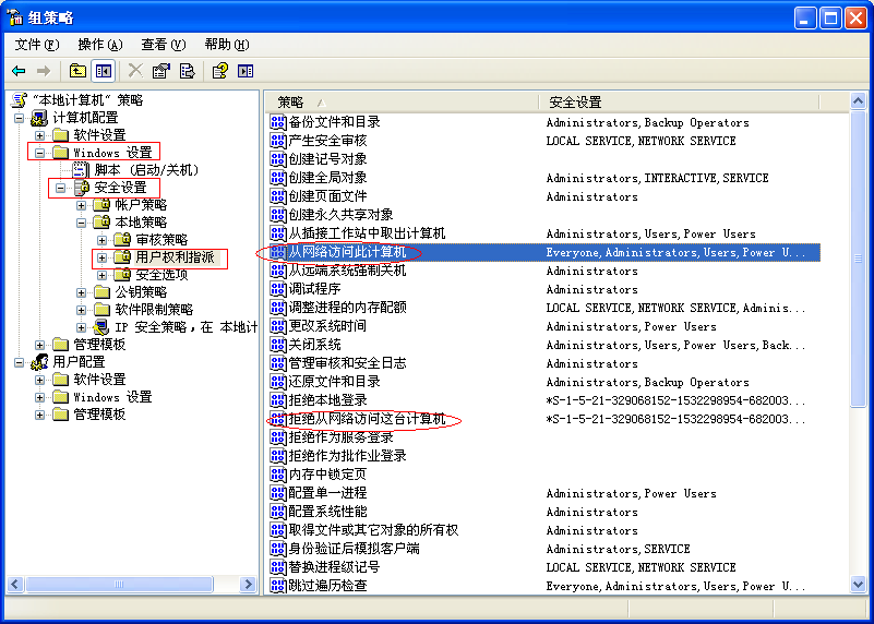 2.打開 組策略-計(jì)算機(jī)配置-windows設(shè)置-安全設(shè)置-本地策略-用戶權(quán)利指派中,將Guest賬戶添加到從網(wǎng)絡(luò)訪問計(jì)算機(jī),拒絕從網(wǎng)絡(luò)訪問這臺(tái)計(jì)算機(jī)中將Guest賬戶刪除