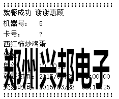 計(jì)算模式下按‘+’號(hào)鍵可進(jìn)行取餐,取餐時(shí)將需要取餐的卡放到刷卡區(qū),消費(fèi)機(jī)可自動(dòng)讀取卡片上的訂餐信息,并將其顯示出來(lái),按‘+’號(hào)鍵可翻頁(yè)查看訂餐信息,按‘確認(rèn)’可進(jìn)行取餐,取餐成功后會(huì)顯示就餐成功、菜肴名稱(chēng)、份數(shù)、扣費(fèi)金額,若連接的有打印機(jī),可打印取餐信息,打印的格式如下圖所示: