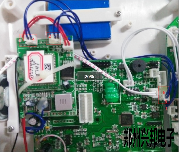 安裝好后,注意走線(xiàn),通訊線(xiàn)如圖3-1中所示,下壓到板子下面。電源線(xiàn)從GPRS模塊下方穿過(guò)。
