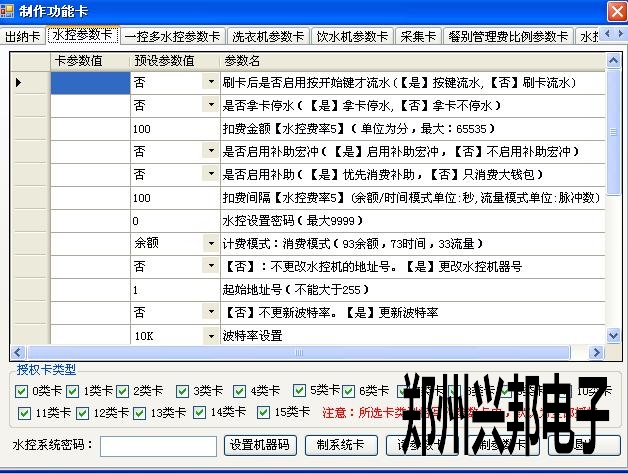 互聯網 一卡通浴室水控機,具有多費率扣費功能,不同卡類型的卡片可以按不同的費率扣費,甚至免費使用,費率最多可以設置5個費率,分別是費率1(最低消費周期,分卡類型)、費率2(時間段費率,分卡類型)、費率3(時間段費率,分卡類型)、費率4(時間段費率,分卡類型)、費率5(不分卡類型)。下面介紹一下在軟件中如何設置: