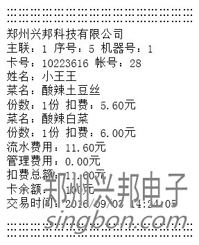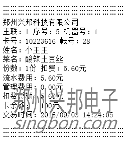 2) 時間段消費模式:以24小時為準,最多可設置8個時間段費率,每個時間段可設置對應的菜肴、份數,將費率設置好之后在自動模式放卡即可自動扣除相應費用。只有計算和自動模式可以用,計算模式只作為查看使用,不能扣費。若連接的有打印機,可打印消費明細,打印出來的消費明細格式如下圖所示:
