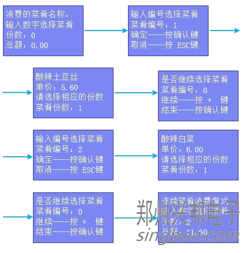 ③ 連續菜肴消費模式:輸入菜肴編號,點擊確認后選擇份數,點擊確認后出現“是否繼續選擇菜肴,菜肴編號:0,繼續----按 + 鍵,結束----按確認鍵”,點擊“+”號,輸入下一份菜肴編號,點擊確認后選擇份數,點擊確認后出現是“是否繼續選擇菜肴,菜肴編號:0,繼續----按 + 鍵,結束----按確認鍵”,點擊確認,出現消費的份數、總額,將卡片放于刷卡區,即可進行扣費,扣費后顯示扣費金額、手續費用、卡上余額、卡號,操作流程如下圖所示: