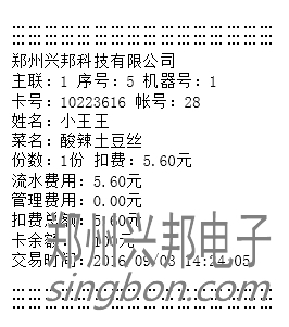 3) 自動消費模式:最多可設置8個費率,每個費率可設置對應的菜肴、份數,將費率設置好之后在自動模式下輸入相應的費率編號放卡即可自動扣除相應費用。只有計算和自動模式可以用,計算模式只作為查看使用,不能扣費。若連接的有打印機,可打印消費明細,打印出來的消費明細格式如下圖所示: